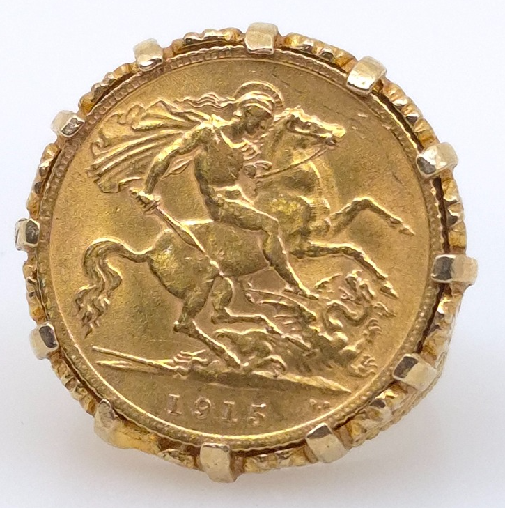 22CT SOVEREIGN KING GEORGE 1915 9CT GOLD RING Total Item Weight: 11.00g Markings: 375 Condition: Good - Refer To Images 587643+1