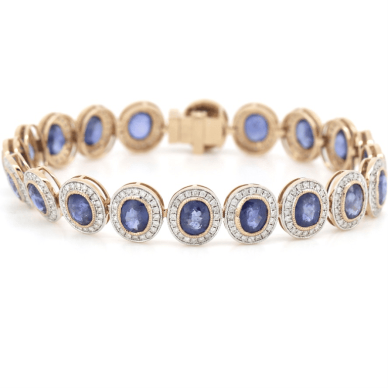 14K ROSE GOLD, BLUE SAPPHIRE AND DIAMOND, HALO BRACELET.