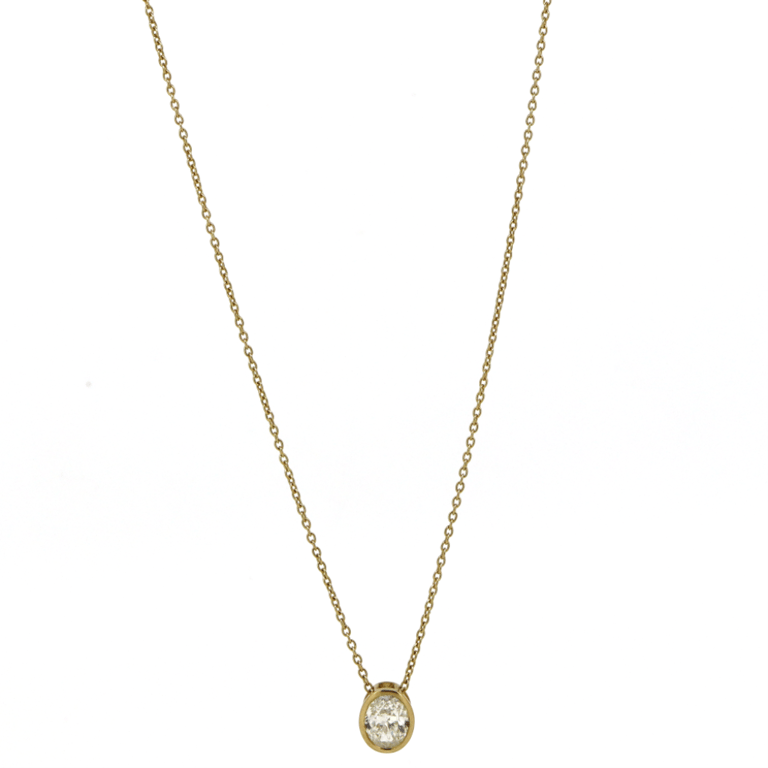 14K YELLOW GOLD AND 1.02CT DIAMOND, SLIDER PENDANT NECKLACE. The Pendant Features, One Oval Brilliant Cut, Diamond (1.02Ct, H-I Colour, Si2-P1 Clarity), Bezel Set. The Necklace Features A Lobster Claw Clasp. Necklace Length Is 45Cm. Valuations Provided by an Independent Third-Party Professional Not Directly Associated With Lloyds Auctions at AUD $$18,000.00This valuation has been conducted by an independent third-party professional. The valuation amount is an assessment by the issuing valuer and does not reflect the auction value of the item. Any inquiries regarding the valuation should be directed to the issuing valuer (refer to contact details on the certificate), as Lloyds Auctions has no affiliation or influence over the valuation, the valuer, or the stated amount. Condition: Good - Refer Images 0645847+31