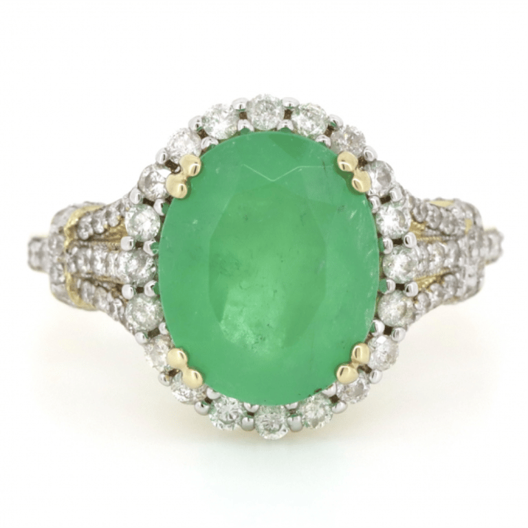 The Centre Features, One Oval Cut, Medium Bluish-Green, Colombian Emerald (4.39Ct, Moderate Eye Visible Inclusions), Double 4 Claw Set. Surrounding The Centre In A Halo And Decorating The Setting Are, 60 Round Brilliant Cut, Diamonds (0.72Ct Tdw, J-K Colour, Si2-I2 Clarity), Claw/Bead Set In White Gold With Millegrain Detail. Ring Size P 1/2.