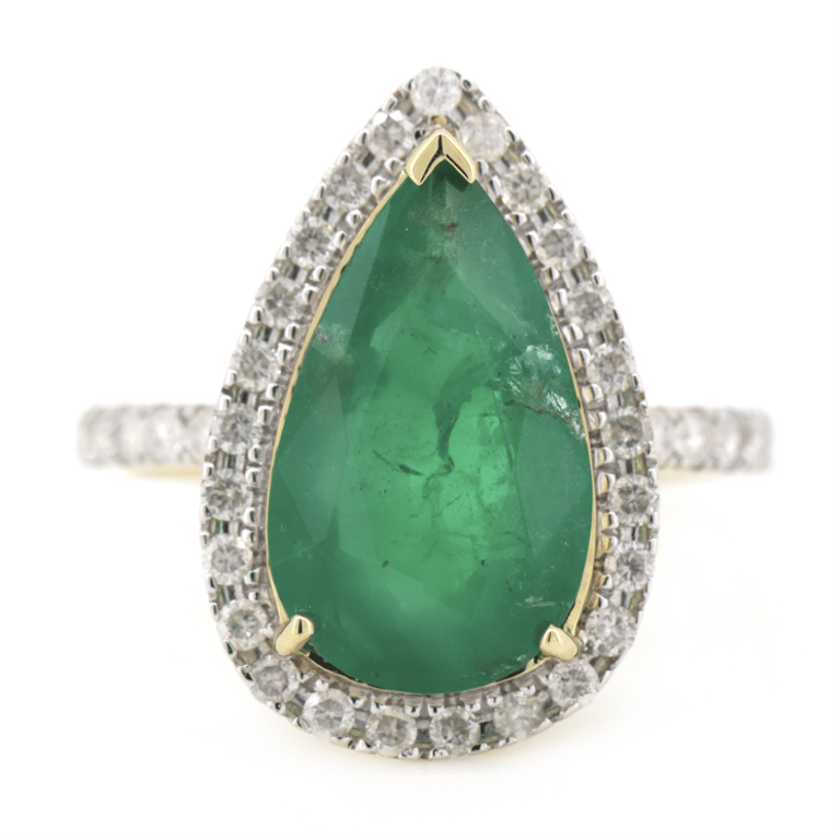 The Centre Features, One Pear Cut, Medium Bluish-Green, Emerald (3.52Ct, Moderate Eye Visible Inclusions), Claw Set In Yellow Gold. Encompassing The Centre Are, 35 Round Brilliant Cut, Diamonds (0.50Ct Tdw, J-K Colour, Si2-I1 Clarity), Micro-Claw Set In White Gold. Ring Size M 1/2.