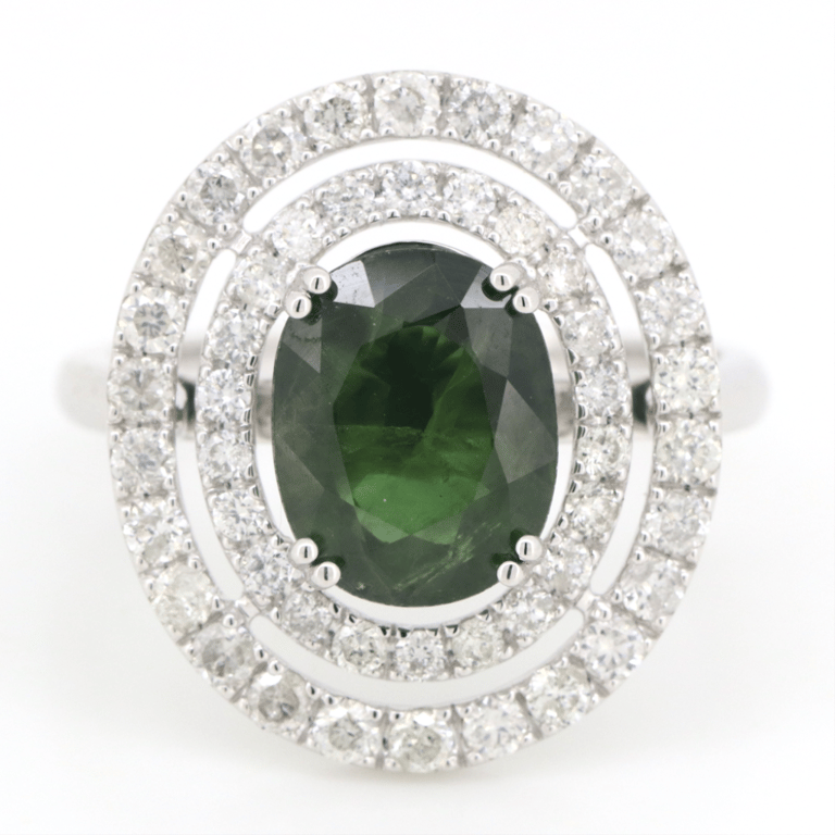14K WHITE GOLD, GREEN SAPPHIRE AND DIAMOND, DOUBLE HALO RING. The Centre Features, One Oval Cut, Deep Green, Sapphire (3.63Ct, Light Natural Inclusions), Double Claw Set. Surrounding The Design Are, 47 Round Brilliant Cut, Diamonds (1.03Ct Tdw, H-K Colour, Si-I2 Clarity), Bead Set. Ring Size P. Valuations Provided by an Independent Third-Party Professional Not Directly Associated With Lloyds Auctions at AUD $$11,000.00This valuation has been conducted by an independent third-party professional. The valuation amount is an assessment by the issuing valuer and does not reflect the auction value of the item. Any inquiries regarding the valuation should be directed to the issuing valuer (refer to contact details on the certificate), as Lloyds Auctions has no affiliation or influence over the valuation, the valuer, or the stated amount. Condition: Good - Refer Images 0645847+27