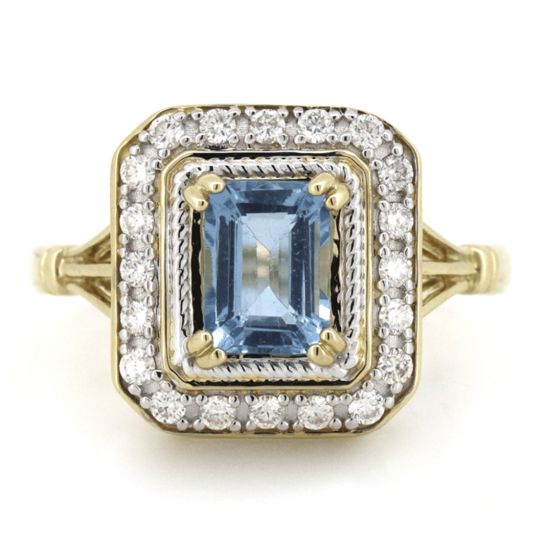14K YELLOW GOLD, AQUAMARINE AND DIAMOND, ANTIQUE INSPIRED RING. The Centre Features, One Emerald Cut, Medium Blue, Aquamarine (1.06Ct, Eye Clean Clarity), Double 4 Claw Set. Surrounding The Centre In A Halo Are, 20 Round Brilliant Cut, Diamonds (0.28Ct Tdw, H-J Colour, Si Clarity), Bead Set In White Gold. Ring Size O. Valuations Provided by an Independent Third-Party Professional Not Directly Associated With Lloyds Auctions at AUD $$10,200.00This valuation has been conducted by an independent third-party professional. The valuation amount is an assessment by the issuing valuer and does not reflect the auction value of the item. Any inquiries regarding the valuation should be directed to the issuing valuer (refer to contact details on the certificate), as Lloyds Auctions has no affiliation or influence over the valuation, the valuer, or the stated amount. Condition: Good - Refer Images 0645847+93