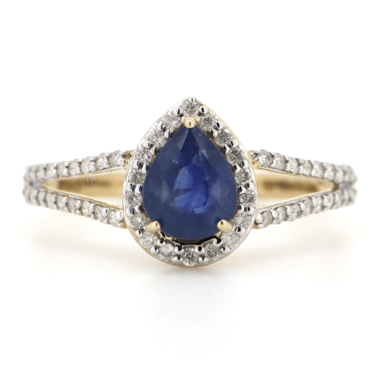 14K YELLOW GOLD, 1.29CT CEYLON SAPPHIRE AND DIAMOND, HALO SPLIT BAND RING. The Centre Features, One Pear Cut, Blue Royal Blue, Ceylon Sapphire (1.29Ct, Slightly Included), Claw Set. Surrounding The Centre In A Halo And Decorating The Split Band Are, 54 Round Brilliant Cut, Diamonds (0.30Ct Tdw, I-K Colour, Si2-P2 Clarity), Claw Set. Ring Size N. Valuations Provided by an Independent Third-Party Professional Not Directly Associated With Lloyds Auctions at AUD $$7,650.00This valuation has been conducted by an independent third-party professional. The valuation amount is an assessment by the issuing valuer and does not reflect the auction value of the item. Any inquiries regarding the valuation should be directed to the issuing valuer (refer to contact details on the certificate), as Lloyds Auctions has no affiliation or influence over the valuation, the valuer, or the stated amount. Condition: Good - Refer Images 0645847+99