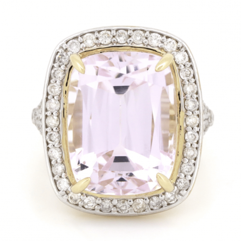 14K YELLOW GOLD, 15.99CT KUNZITE AND DIAMOND, STATEMENT RING. The Centre Features, One Cushion Cut, Light Purplish-Pink, Kunzite (15.99Ct, Very Minor Eye Visible Inclusions), 4 Claw Set. Surrounding The Centre In A Halo And Decorating The Shoulders Are, 66 Round Brilliant Cut, Diamonds (0.78Ct Tdw, J-K Colour, Si2-I2 Clarity), Micro-Claw/Bead Set In White Gold. Ring Size L 1/2. Valuations Provided by an Independent Third-Party Professional Not Directly Associated With Lloyds Auctions at AUD $$14,290.00This valuation has been conducted by an independent third-party professional. The valuation amount is an assessment by the issuing valuer and does not reflect the auction value of the item. Any inquiries regarding the valuation should be directed to the issuing valuer (refer to contact details on the certificate), as Lloyds Auctions has no affiliation or influence over the valuation, the valuer, or the stated amount. Condition: Good - Refer Images 0645847+3