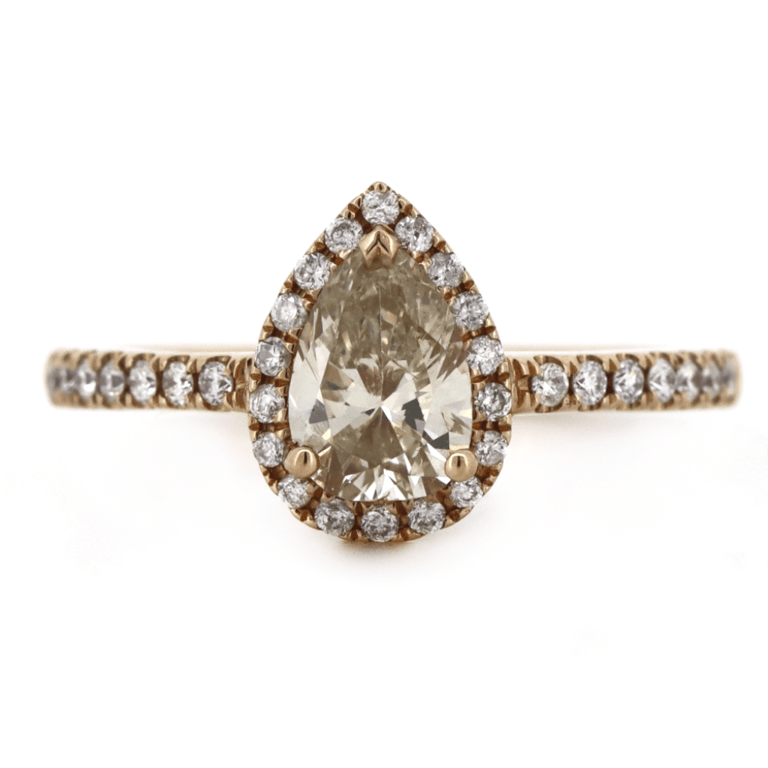 The Centre Features, One Pear Cut, Fancy Light Brown, Diamond (0.82Ct, Si1 Clarity), Claw Set. Surrounding The Centre In A Halo And Decorating The Band Are, 32 Round Brilliant Cut, Diamonds (0.21Ct Tdw, G-H Colour, Si1-I1 Clarity), Micro-Claw Set. Ring Size M.