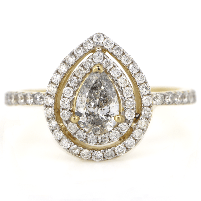 The Centre Features, One Modified Pear Cut, Diamond (0.52Ct, H-I Colour, P1 Clarity), Claw Set. Surrounding The Centre In A Double Halo And Decorating The Band Are, 59 Round Brilliant Cut, Diamonds (0.41Ct Tdw, G-H Colour, Si1-Si2 Clarity), Claw Set. Ring Size N.