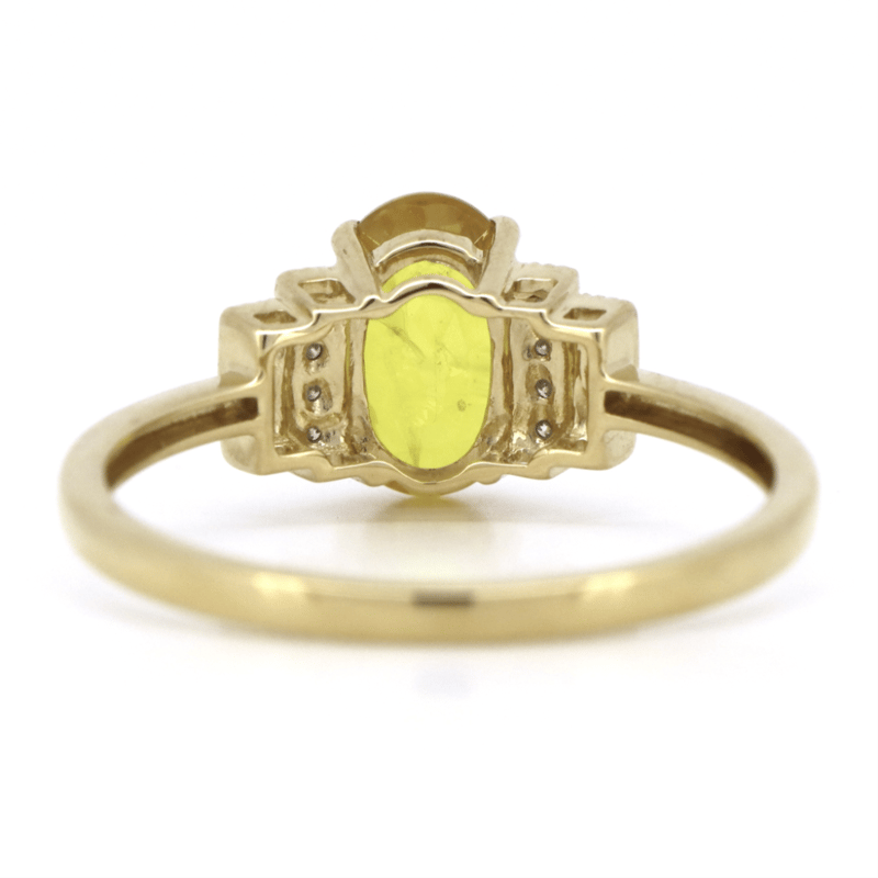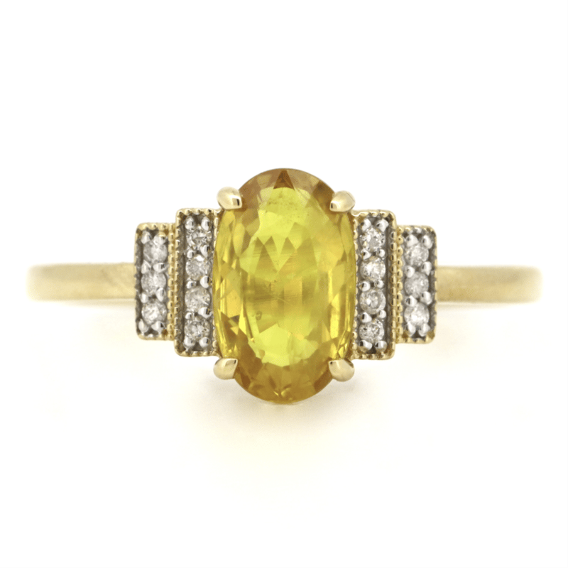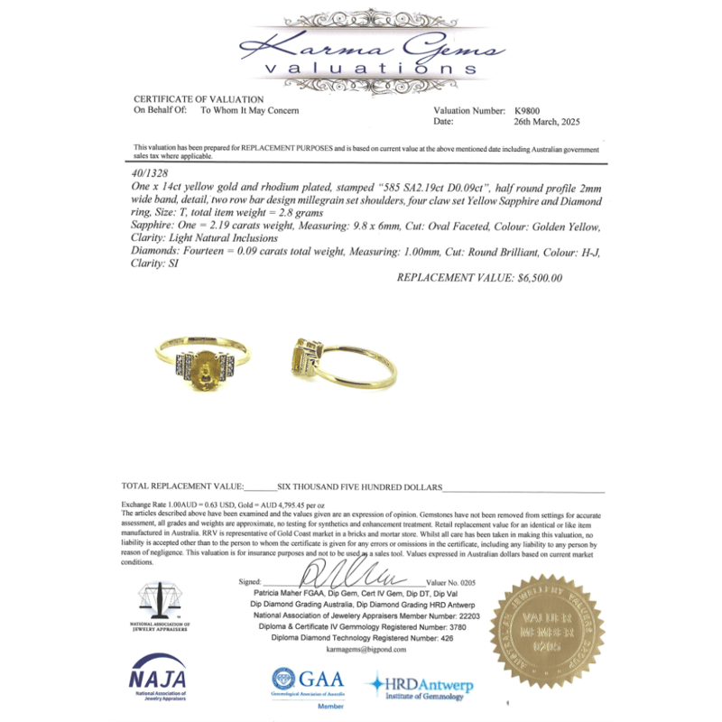 14K YELLOW GOLD, YELLOW SAPPHIRE AND DIAMOND, DRESS RING. The Centre Features, One Oval Cut, Golden-Yellow, Sapphire (2.19Ct,Natural Inclusions-Clarity), Claw Set. Flanking The Centre Are, 14 Round Brilliant Cut, Diamonds (0.09Ct Tdw, H-J Colour, Si Clarity), Bead Set With Millegrain Detail. Ring Size T1/2. Valuations Provided by an Independent Third-Party Professional Not Directly Associated With Lloyds Auctions at AUD $$6,500.00This valuation has been conducted by an independent third-party professional. The valuation amount is an assessment by the issuing valuer and does not reflect the auction value of the item. Any inquiries regarding the valuation should be directed to the issuing valuer (refer to contact details on the certificate), as Lloyds Auctions has no affiliation or influence over the valuation, the valuer, or the stated amount. Condition: Good - Refer Images 0645847+33