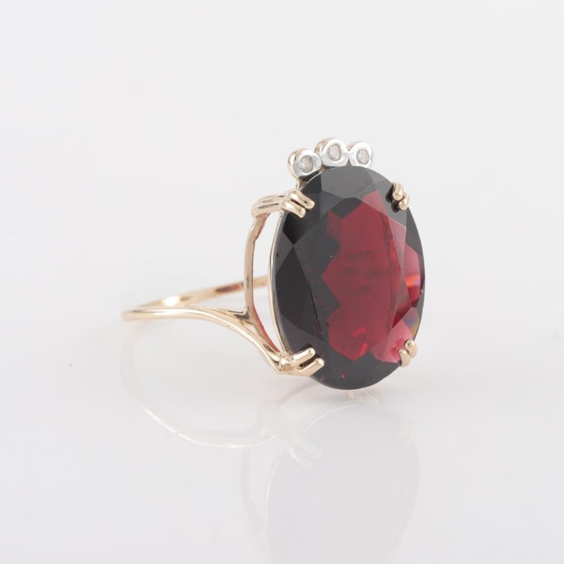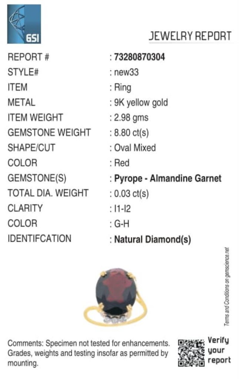 9CT YELLOW GOLD NATURAL GARNET & DIAMOND RING Weight Of The Item: 2.98 GFineness Of Metal(S): Yellow Gold 9KtThe Ring Consists Of (1) Oval Brilliant Natural Garnet. Surrounding The Main Stones Are Round Brilliant Cut Natural Diamonds.Identification: Natural GarnetColor: RedShape: Oval Brilliant CutNo. Of Stone: 1Dimension: 15 Mm X 11 Mm X 9 MmWeight: 8.8 CaratsCut: Very GoodIdentification: Natural DiamondShape: Round Brilliant CutWeight: 0.03 CtsCut: Excellent.Certificates Are Provided By Gemological Science International (Gsi), An Independent Third-Party Gemological Laboratory Based In The Usa And Recognised Among The Top 10 Gem Labs Globally Markings: 9ct Condition: Good - Refer Images 0488218+48