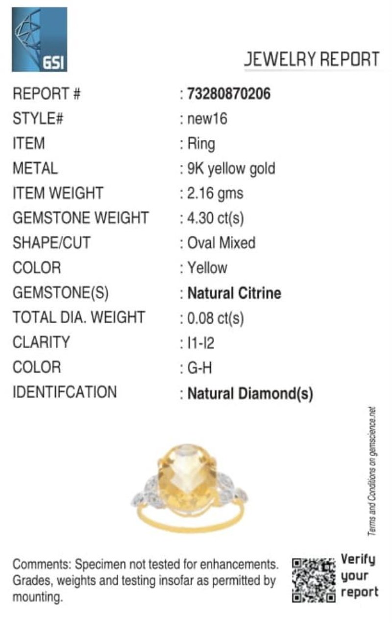 9CT YELLOW GOLD NATURAL CITRINE & DIAMOND RING Weight Of The Item: 2.16 GFineness Of Metal(S): Yellow Gold 9KtThe Ring Consists Of (1) Oval Brilliant Natural Citrine. Surrounding The Main Stones Are Round Brilliant Cut Natural Diamonds.Identification: Natural CitrineColor: YellowShape: Oval Brilliant CutNo. Of Stone: 1Dimension: 12 Mm X 10 Mm X 7.2 MmWeight: 4.3 CaratsCut: Very GoodIdentification: Natural DiamondShape: Round Brilliant CutWeight: 0.08 CtsCut: Excellent.Certificates Are Provided By Gemological Science International (Gsi), An Independent Third-Party Gemological Laboratory Based In The Usa And Recognised Among The Top 10 Gem Labs Globally Markings: 9ct Condition: Good - Refer Images 0488218+12