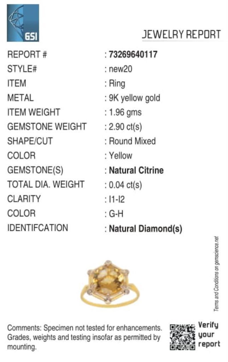 9CT YELLOW GOLD NATURAL CITRINE & DIAMOND RING Weight Of The Item: 1.96 GFineness Of Metal(S): Yellow Gold 9KtThe Ring Consists Of (1) Round Brilliant Natural Citrine. Surrounding The Main Stones Are Round Brilliant Cut Natural Diamonds.Identification: Natural CitrineColor: YellowShape: Round Brilliant CutNo. Of Stone: 1Dimension: 10 Mm X 10 Mm X 6 MmWeight: 2.9 CaratsCut: Very GoodIdentification: Natural DiamondShape: Round Brilliant CutWeight: 0.04 CtsCut: Excellent.Certificates Are Provided By Gemological Science International (Gsi), An Independent Third-Party Gemological Laboratory Based In The Usa And Recognised Among The Top 10 Gem Labs Globally Markings: 9ct Condition: Good - Refer Images 0488218+21
