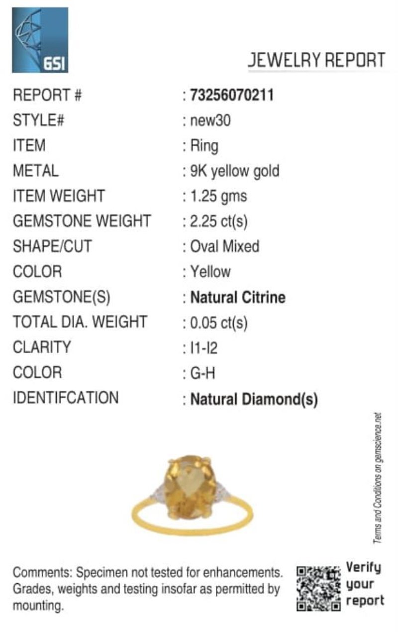 9CT YELLOW GOLD NATURAL CITRINE & DIAMOND RING Weight Of The Item: 1.25 GFineness Of Metal(S): Yellow Gold 9KtThe Ring Consists Of (1) Oval Brilliant Natural Citrine. Surrounding The Main Stones Are Round Brilliant Cut Natural Diamonds.Identification: Natural CitrineColor: YellowShape: Oval Brilliant CutNo. Of Stone: 1Dimension: 10 Mm X 8 Mm X 6 MmWeight: 2.25 CaratsCut: Very GoodIdentification: Natural DiamondShape: Round Brilliant CutWeight: 0.05 CtsCut: Excellent.Certificates Are Provided By Gemological Science International (Gsi), An Independent Third-Party Gemological Laboratory Based In The Usa And Recognised Among The Top 10 Gem Labs Globally Markings: 9ct Condition: Good - Refer Images 0488218+35