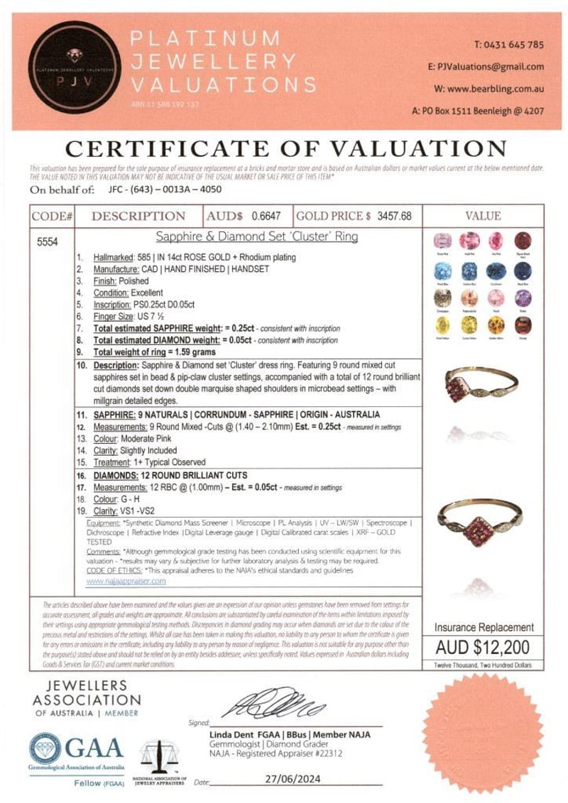 14CT ROSE GOLD PINK AUSTRALIAN SAPPHIRE AND DIAMOND CLUSTER RING FEATURING CENTRE, 9 ROUND CUT, MODERATE PINK AUSTRALIAN SAPPHIRES (0.25CT TSW, SLIGHTLY INCLUDED), PIP CLAW SET, WITH 12 ROUND BRILLIANT CUT DIAMONDS (0.05CT TDW, G-H COLOUR, VS1-VS2 CLARITY), MICRO BEAD SET. RING SIZE O. Valuations Provided by an Independent Third-Party Professional Not Directly Associated With Lloyds Auctions at AUD $12200This valuation has been conducted by an independent third-party professional. The valuation amount is an assessment by the issuing valuer and does not reflect the auction value of the item. Any inquiries regarding the valuation should be directed to the issuing valuer (refer to contact details on the certificate), as Lloyds Auctions has no affiliation or influence over the valuation, the valuer, or the stated amount. 0+1292
