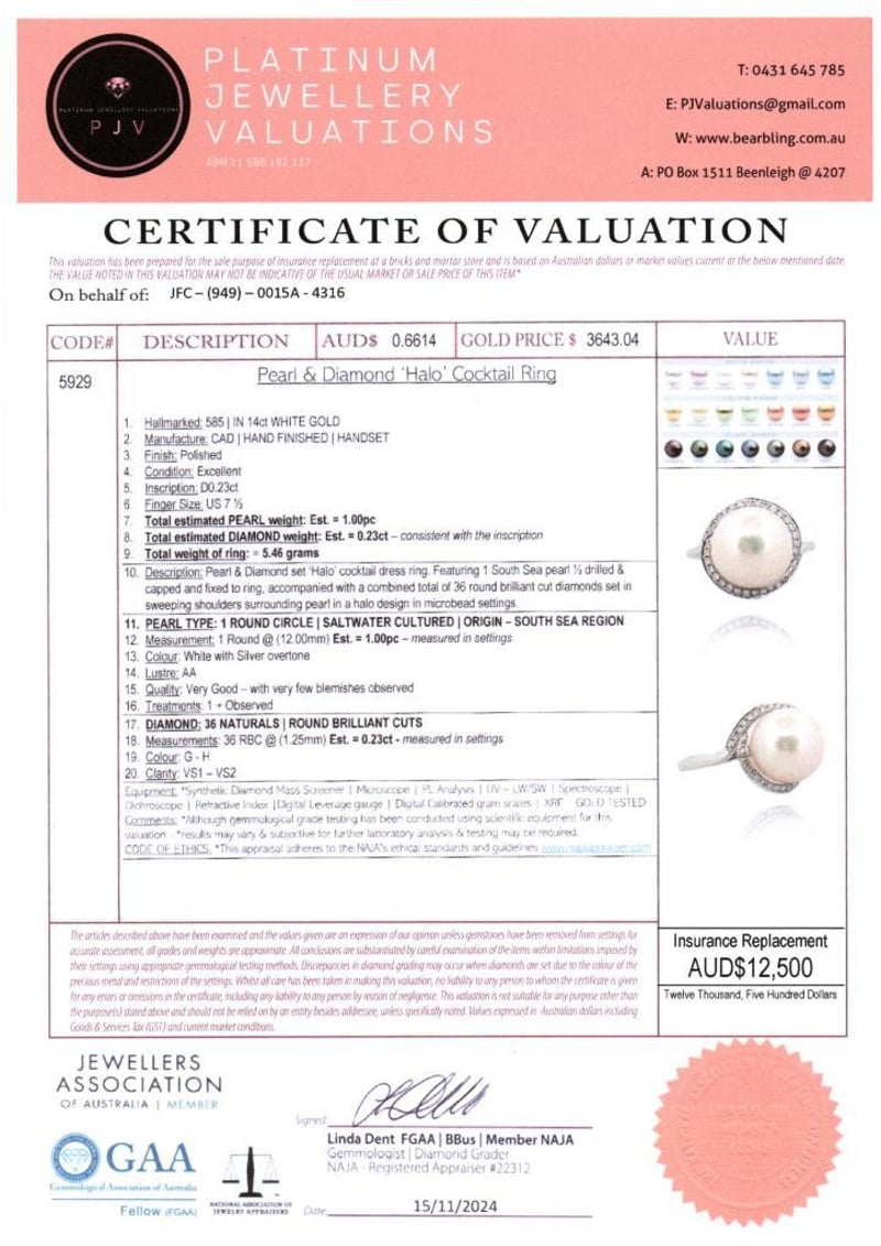 14CT WHITE GOLD PEARL AND DIAMOND HALO RING FEATURING CENTRE, ONE ROUND, SILVERY-WHITE CULTURED SOUTH SEA PEARL (12.00MM SIZE, AA GRADE), DRILL SET, WITH 36 ROUND BRILLIANT CUT DIAMONDS (0.23CT TDW, G-H COLOUR, VS1-VS2 CLARITY), BEAD SET. RING SIZE O. Valuations Provided by an Independent Third-Party Professional Not Directly Associated With Lloyds Auctions at AUD $12500This valuation has been conducted by an independent third-party professional. The valuation amount is an assessment by the issuing valuer and does not reflect the auction value of the item. Any inquiries regarding the valuation should be directed to the issuing valuer (refer to contact details on the certificate), as Lloyds Auctions has no affiliation or influence over the valuation, the valuer, or the stated amount. 0+1303