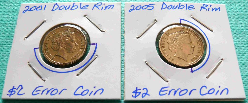 2001 AND 2005 DOUBLE RIM $2 ERROR COINS.