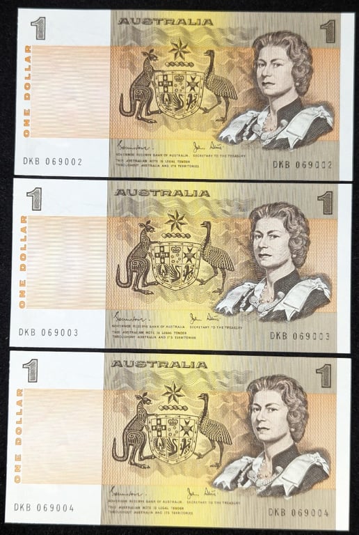 THREE CONSECUTIVE 1982 AUSTRALIAN ONE DOLLAR BANKNOTESCondition: Aunc584892+143