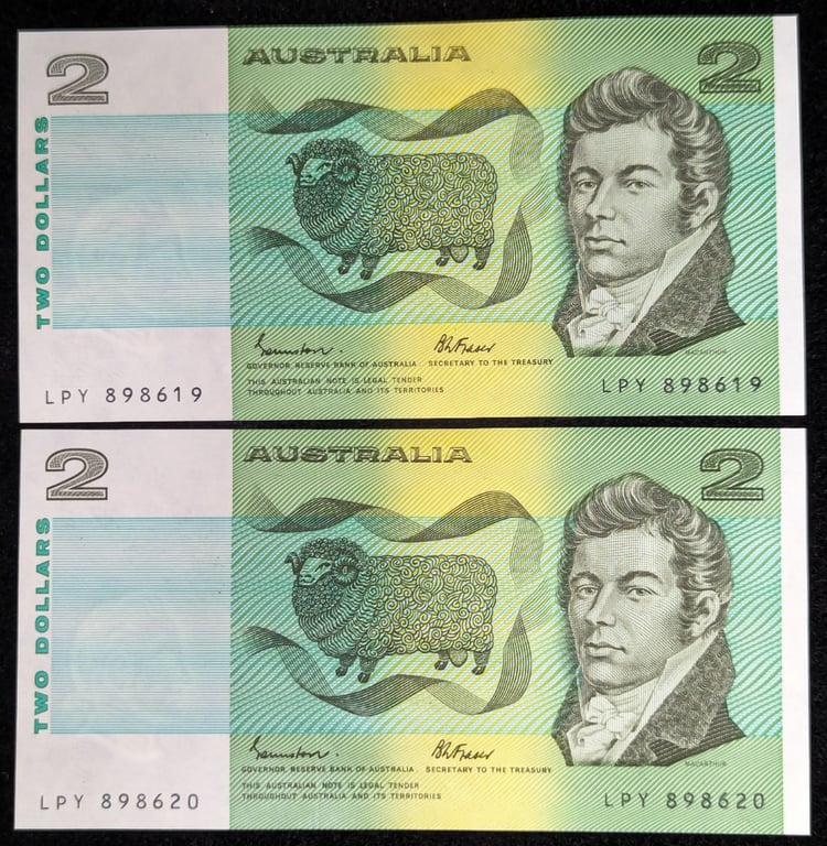 TWO CONSECUTIVE AUSTRALIAN 1985 TWO DOLLAR BANKNOTESBanknotes Signed By Johnston/FraserCondition: Aunc584892+144