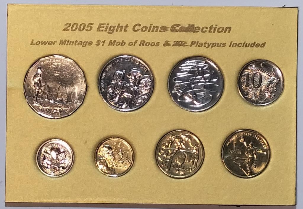 2005 EIGHT COINS COLLECTION LOWER MINTAGE $1 MOB OF ROOS & 20C PLATYPUS INCLUDED Condition: UNCEx Mint Roll23528+6