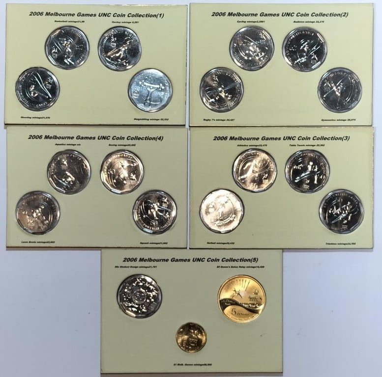 2006 MELBOURN XVIII COMMONWEALTH GAMES 50C COIN SET 16+3 Include: 16Xsport 50C; 1Xstudent Design 50C; 1X $5 Queen Baton Relay; And 1X$1 Melb.Games(Extra). 19 Coins In Total. Condition: UNCEx Mint Card/Pnc23528+17