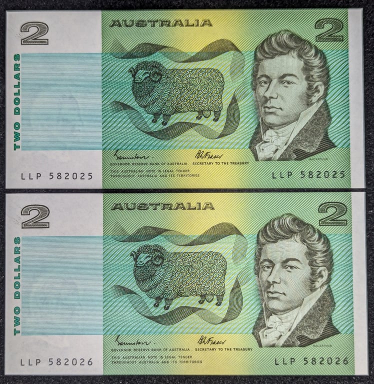 TWO CONSECUTIVE 1985 AUSTRALIAN TWO DOLLAR ERROR BANKNOTESInk Mark In Note CornerCondition: Aunc584892+107