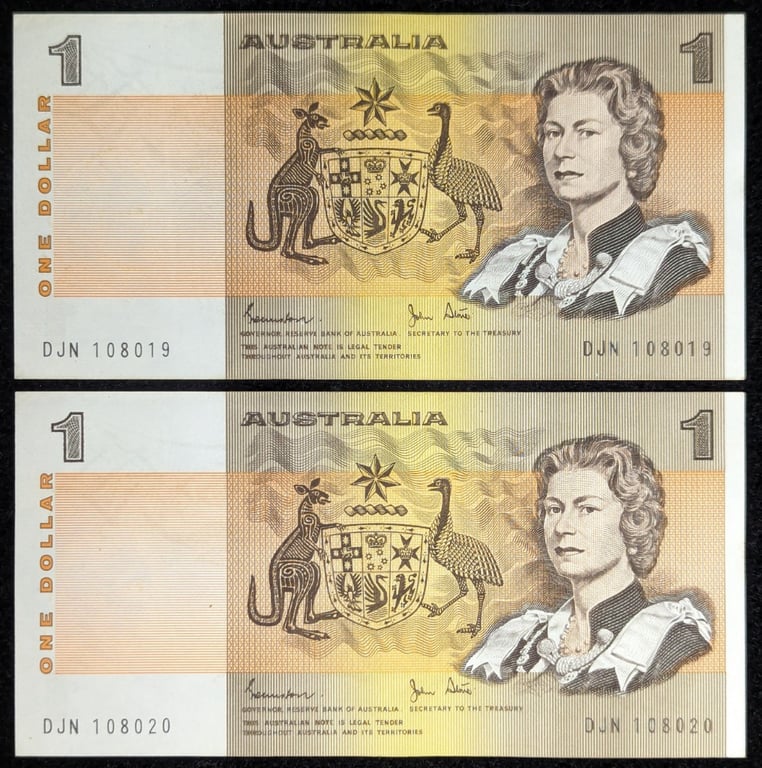TWO CONSECUTIVE 1982 AUSTRALIAN ONE DOLLAR BANKNOTESBanknotes Signed By Johnston/StoneCondition: Ef584892+145