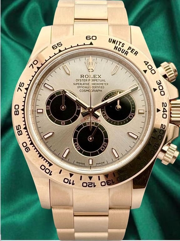 ROLEX DAYTONA ROSE GOLD/EVEROSE SUNDUST & BLACK DIAL 126505 | 2025 | 40MM Price Guide - $91,000 - $113,500 Brand : Rolex Reference : 126505 Model : Daytona Year : 2025 Condition : New Case Size : 40Mm Power Reserve : 72H Dial : Sundust Bezel : Rose Gold Case : Rose Gold Bracelet : Rose Gold Papers : Yes Box : Yes 488259+16