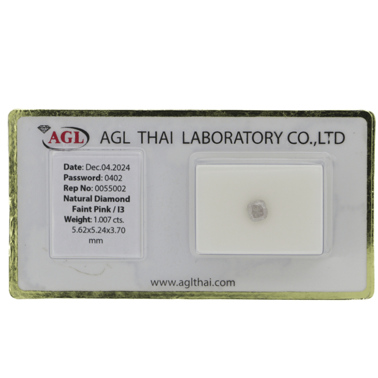 1.007CT CERTIFIED, NATURAL PINK DIAMOND, CUSHION BRILLIANT CUT, FAINT PINK COLOUR, I3 CLARITY, LOOSE, UNSET. Stone Comes Sealed With Agl Report: 0055002. Valuations Provided by an Independent Third-Party Professional Not Directly Associated With Lloyds Auctions at AUD $$30,000.00This valuation has been conducted by an independent third-party professional. The valuation amount is an assessment by the issuing valuer and does not reflect the auction value of the item. Any inquiries regarding the valuation should be directed to the issuing valuer (refer to contact details on the certificate), as Lloyds Auctions has no affiliation or influence over the valuation, the valuer, or the stated amount. Condition: Good - Refer Images 0645842+3164