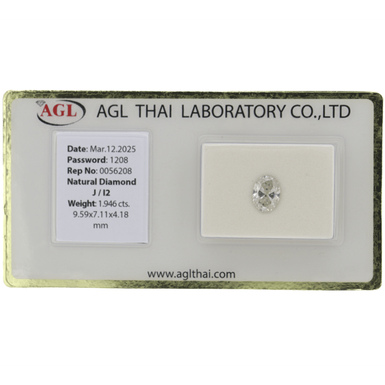 1.946CT CERTIFIED, NATURAL DIAMOND, OVAL BRILLIANT CUT, J COLOUR, I2 CLARITY, LOOSE, UNSET. Stone Comes Sealed With Agl Report: 0056208. Valuations Provided by an Independent Third-Party Professional Not Directly Associated With Lloyds Auctions at AUD $$27,000.00This valuation has been conducted by an independent third-party professional. The valuation amount is an assessment by the issuing valuer and does not reflect the auction value of the item. Any inquiries regarding the valuation should be directed to the issuing valuer (refer to contact details on the certificate), as Lloyds Auctions has no affiliation or influence over the valuation, the valuer, or the stated amount. Condition: Good - Refer Images 0645842+3160