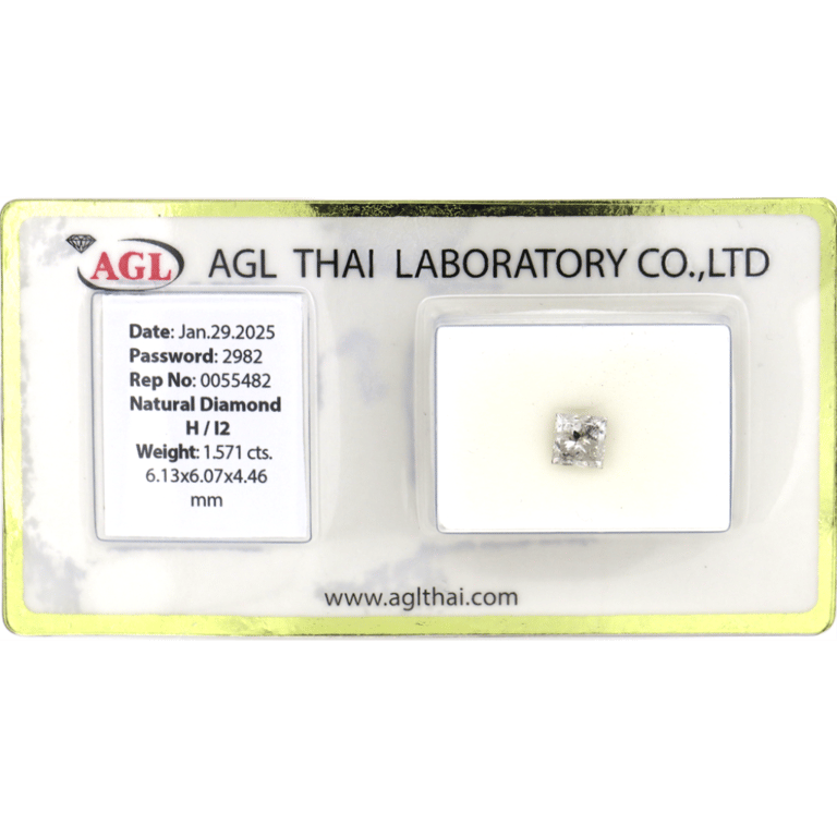 1.571CT CERTIFIED, NATURAL DIAMOND, PRINCESS CUT, H COLOUR, I2 CLARITY, LOOSE, UNSET. Stone Comes Sealed With Agl Report: 0055482. Valuations Provided by an Independent Third-Party Professional Not Directly Associated With Lloyds Auctions at AUD $$14,500.00This valuation has been conducted by an independent third-party professional. The valuation amount is an assessment by the issuing valuer and does not reflect the auction value of the item. Any inquiries regarding the valuation should be directed to the issuing valuer (refer to contact details on the certificate), as Lloyds Auctions has no affiliation or influence over the valuation, the valuer, or the stated amount. Condition: Good - Refer Images 0645842+3168