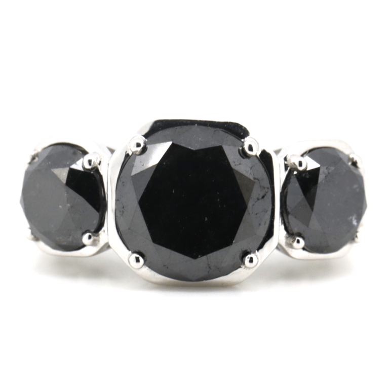 The Design Features, 3 Round Brilliant Cut, Black, Diamonds (8.21Ct Tdw, Opaque), Claw Set. Decorating The Shoulders Are, 6 Round Brilliant Cut, Diamonds (0.07Ct Tdw, H-K Colour, P2+ Clarity), Micro-Bead Set. Ring Size M 1/2.