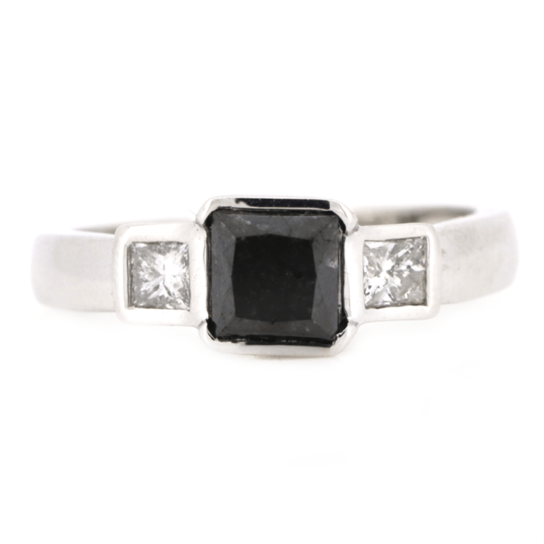 14K WHITE GOLD, BLACK DIAMOND AND DIAMOND, TRILOGY RING. The Centre Features, One Princess Cut, Black, Diamond (1.22Ct, Opaque), Bezel Set. Flanked By, 2 Princess Cut, Diamonds (0.27Ct Tdw, H-I Colour, Si-I1 Clarity), Bezel Set. Ring Size M. Valuations Provided by an Independent Third-Party Professional Not Directly Associated With Lloyds Auctions at AUD $$8,500.00This valuation has been conducted by an independent third-party professional. The valuation amount is an assessment by the issuing valuer and does not reflect the auction value of the item. Any inquiries regarding the valuation should be directed to the issuing valuer (refer to contact details on the certificate), as Lloyds Auctions has no affiliation or influence over the valuation, the valuer, or the stated amount. Condition: Good - Refer Images 0645842+3166