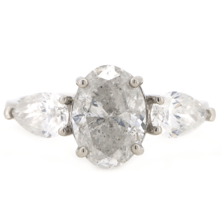 PT 950 AND DIAMOND, TRILOGY RING. The Centre Features, One Oval Faceted Cut, Diamond (2.09Ct, H-I Colour, P2 Clarity), Claw Set. Encompassing The Centre Are, 2 Pear Brilliant Cut, Diamonds (1.02Ct Tdw, G-H Clarity, Si1-Si2 Colour), Claw Set. Ring Size N 1/2. Valuations Provided by an Independent Third-Party Professional Not Directly Associated With Lloyds Auctions at AUD $$65,000.00This valuation has been conducted by an independent third-party professional. The valuation amount is an assessment by the issuing valuer and does not reflect the auction value of the item. Any inquiries regarding the valuation should be directed to the issuing valuer (refer to contact details on the certificate), as Lloyds Auctions has no affiliation or influence over the valuation, the valuer, or the stated amount. Condition: Good - Refer Images 0645842+3107
