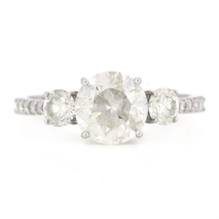 The Centre Features, One Round Brilliant Cut, Diamond (1.50Ct, I- J Colour, P2 Clarity), Claw Set. Decorating The Shoulders Are, 2 Round Brilliant Cut, Diamonds (0.44Ct Tdw, H-I Colour, Si2-P1-Clarity), Claw Set. Embellishing The Band Are, 12 Round Brilliant Cut, Diamonds (0.107Ct Tdw, H-I Colour, Si2-P1-Clarity), Claw Set. Ring Size M 1/2.