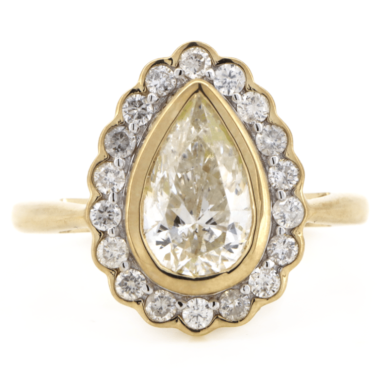 The Centre Features, One Pear Modified Cut, Diamond (1.61Ct, I-J Colour, Si1-Si2 Clarity), Bezel Set. Encompassing The Centre In A Halo Are, 18 Round Brilliant Cut, Diamonds (0.45Ct Tdw, G-H Colour, Si1-Si2 Clarity), Bead/Bezel Set. Ring Size O.