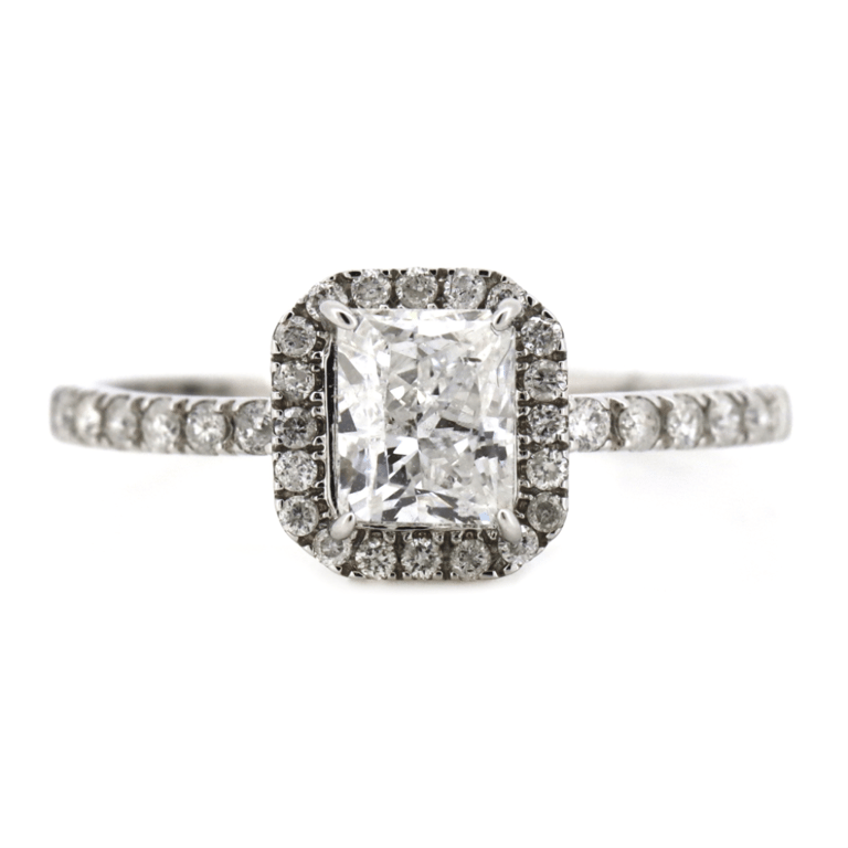 14K WHITE GOLD AND DIAMOND, HALO RING. The Centre Features, One Emerald Brilliant Cut, Diamond (1.01Ct, H-I Colour, P2 Clarity), Claw Set. Surrounding The Centre And Decorating The Band Are, 32 Round Brilliant Cut, Diamonds (0.22Ct Tdw, H-J Colour, Si2-P2 Clarity), Claw Set. Ring Size M. Valuations Provided by an Independent Third-Party Professional Not Directly Associated With Lloyds Auctions at AUD $$19,780.00This valuation has been conducted by an independent third-party professional. The valuation amount is an assessment by the issuing valuer and does not reflect the auction value of the item. Any inquiries regarding the valuation should be directed to the issuing valuer (refer to contact details on the certificate), as Lloyds Auctions has no affiliation or influence over the valuation, the valuer, or the stated amount. Condition: Good - Refer Images 0645842+3162