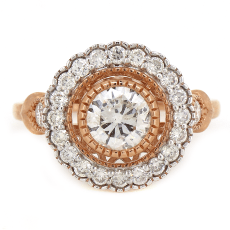14K ROSE GOLD AND DIAMOND, VINTAGE INSPIRED RING. The Centre Features, One Round Brilliant Cut, Diamond (0.70Ct, J-K Colour, Si2 Clarity), Bezel Set. Surrounding The Centre In A Halo And Decorating The Shoulders Are, 22 Round Brilliant Cut, Diamonds (0.48Ct Tdw, I-K Colour, Si1-P1 Clarity), Bead Set With Millegrain Detail. Ring Size M. Valuations Provided by an Independent Third-Party Professional Not Directly Associated With Lloyds Auctions at AUD $$15,250.00This valuation has been conducted by an independent third-party professional. The valuation amount is an assessment by the issuing valuer and does not reflect the auction value of the item. Any inquiries regarding the valuation should be directed to the issuing valuer (refer to contact details on the certificate), as Lloyds Auctions has no affiliation or influence over the valuation, the valuer, or the stated amount. Condition: Good - Refer Images 0645842+3198