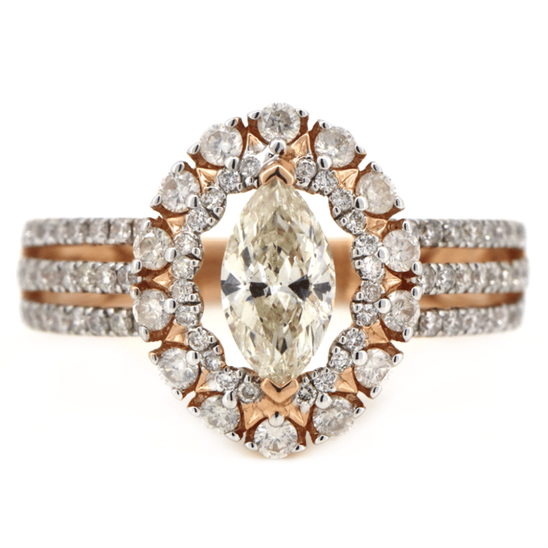 14K WHITE/ROSE GOLD, DIAMOND, DOUBLE HALO SPLIT BAND RING. The Centre Features, One Marquise Brilliant Cut, Diamond (0.61Ct, I-J Colour, Si1-Si2 Clarity), 2 Claw Set. Surrounding The Centre In A Double Halo And Decorating The Band Are, 94 Round Brilliant Cut, Diamonds (0.63Ct Tdw, G-H Colour, Si1-Si2 Clarity), Micro-Bead/Pip-Claw Set. Ring Size N 1/2. Valuations Provided by an Independent Third-Party Professional Not Directly Associated With Lloyds Auctions at AUD $$20,000.00This valuation has been conducted by an independent third-party professional. The valuation amount is an assessment by the issuing valuer and does not reflect the auction value of the item. Any inquiries regarding the valuation should be directed to the issuing valuer (refer to contact details on the certificate), as Lloyds Auctions has no affiliation or influence over the valuation, the valuer, or the stated amount. Condition: Good - Refer Images 0645842+3158