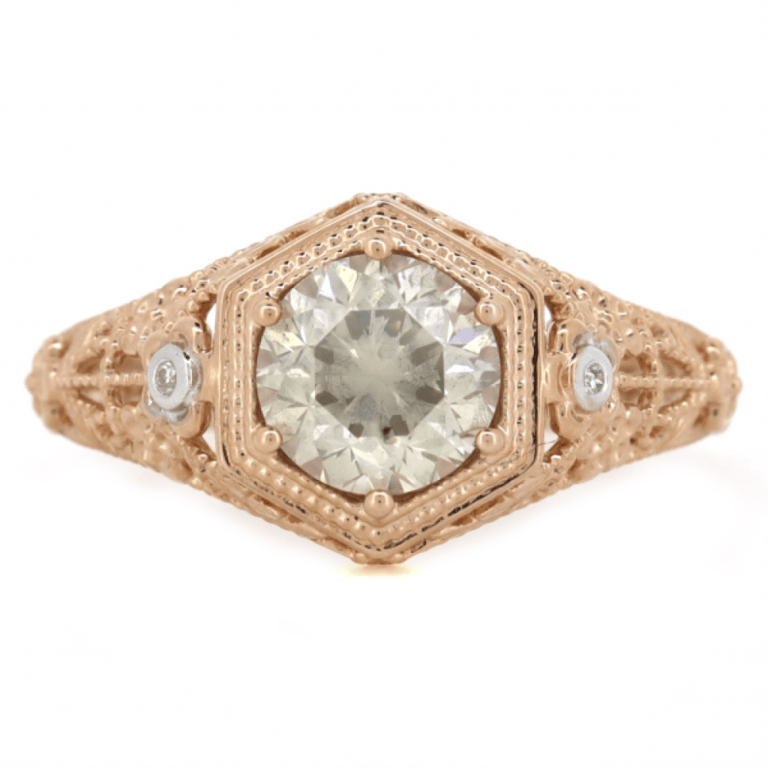 The Centre Features, One Round Brilliant Cut, Champagne, Diamond (1.52Ct, C3 Colour, Salt And Pepper Clarity), 6 Claw Set. Decorating The Shoulders Are, 2 Round Brilliant Cut, Diamonds (0.01Ct Tdw, I-K Colour, P1+ Clarity), Bezel Set. The Band Is Decorated With Elaborate Floral Designs. Ring Size N.