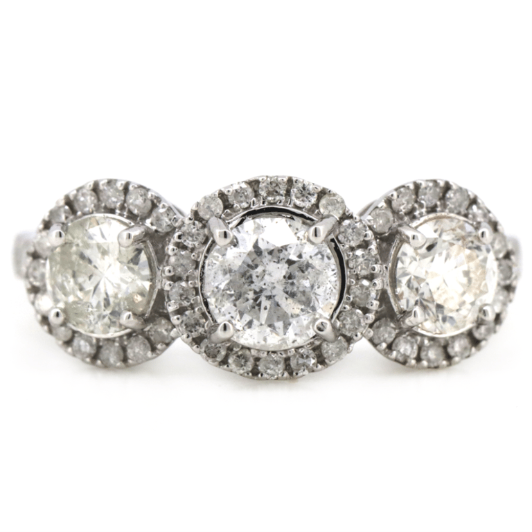 14K WHITE GOLD AND DIAMOND, HALO TRILOGY RING. The Centre Features, 3 Round Brilliant Cut, Diamonds (1.14Ct Tdw, K-L Colour, P2+ Clarity), 4 Claw Set. Surrounded By, 54 Round Brilliant Cut, Diamonds (0.28Ct Tdw, H-K Colour, P2+ Clarity), Micro-Bead Set. Ring Size N. Valuations Provided by an Independent Third-Party Professional Not Directly Associated With Lloyds Auctions at AUD $$9,900.00This valuation has been conducted by an independent third-party professional. The valuation amount is an assessment by the issuing valuer and does not reflect the auction value of the item. Any inquiries regarding the valuation should be directed to the issuing valuer (refer to contact details on the certificate), as Lloyds Auctions has no affiliation or influence over the valuation, the valuer, or the stated amount. Condition: Good - Refer Images 0645842+3137