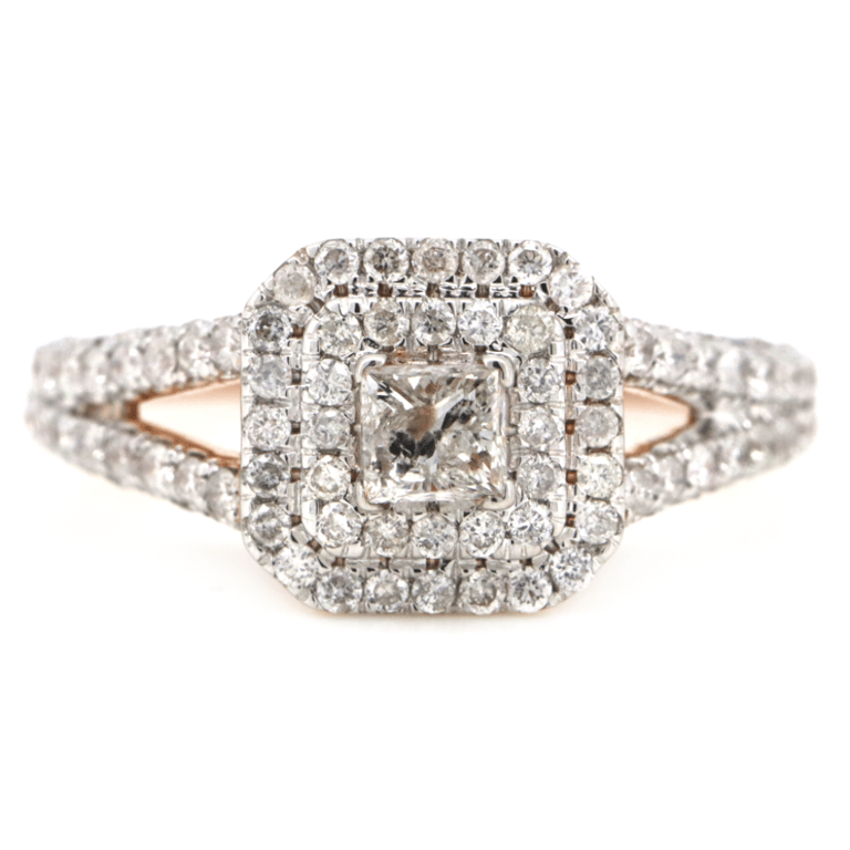 The Centre Features, One Princess Cut, Diamond (0.25Ct, I-J Colour, P2 Clarity), 4 Claw Set. Surrounding The Centre In A Double Halo And Decorating The Split Band Are, 100 Round Brilliant Cut, Diamonds (0.60Ct Tdw, H-J Colour, Si2-P2 Clarity), Claw Set. Ring Size K 1/2.