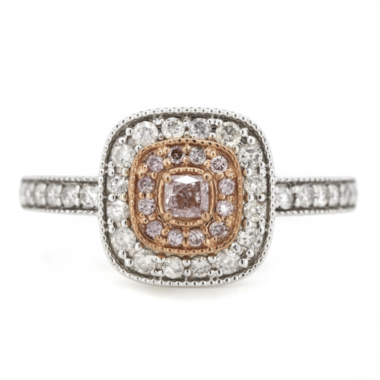14K WHITE/ROSE GOLD, FANCY PINK CHAMPAGNE DIAMOND AND DIAMOND, DOUBLE HALO RING. The Centre Features, One Modified Cushion Cut, Pink Champagne, Diamond (0.12Ct, P2+ Clarity), 4-Claw Set In Rose Gold. Surrounding The Centre In The Inner Halo Are, 12 Round Brilliant Cut, Blush Pink, Diamonds (0.07Ct Tdw, P2+ Clarity), Bead Set In Rose Gold. Surrounding The Centre In The Outer Halo And Decorating The Band Are, 285 Round Brilliant Cut, Diamonds (0.30Ct Tdw, H-K Colour, P2+ Clarity), Bead Set. Ring Size M 1/2. Valuations Provided by an Independent Third-Party Professional Not Directly Associated With Lloyds Auctions at AUD $$8,900.00This valuation has been conducted by an independent third-party professional. The valuation amount is an assessment by the issuing valuer and does not reflect the auction value of the item. Any inquiries regarding the valuation should be directed to the issuing valuer (refer to contact details on the certificate), as Lloyds Auctions has no affiliation or influence over the valuation, the valuer, or the stated amount. Condition: Good - Refer Images 0645842+3163