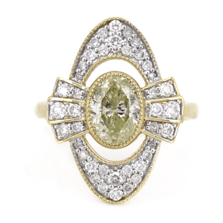 14K YELLOW GOLD, FANCY YELLOW DIAMOND AND DIAMOND, ART DECO INSPIRED RING. The Centre Features, One Oval Brilliant Cut, Fancy Yellow, Diamond (1.38Ct, I1 Clarity), Bezel Set With Millegrain Detail. Surrounding The Centre In A Cluster Are, 40 Round Brilliant Cut, Diamonds (0.52Ct Tdw, G-I Colour, Si-I2 Clarity), Micro-Bead/Bezel Set In White/Yellow Gold With Millegrain Detail. Ring Size N. Valuations Provided by an Independent Third-Party Professional Not Directly Associated With Lloyds Auctions at AUD $$29,300.00This valuation has been conducted by an independent third-party professional. The valuation amount is an assessment by the issuing valuer and does not reflect the auction value of the item. Any inquiries regarding the valuation should be directed to the issuing valuer (refer to contact details on the certificate), as Lloyds Auctions has no affiliation or influence over the valuation, the valuer, or the stated amount. Condition: Good - Refer Images 0645842+3146