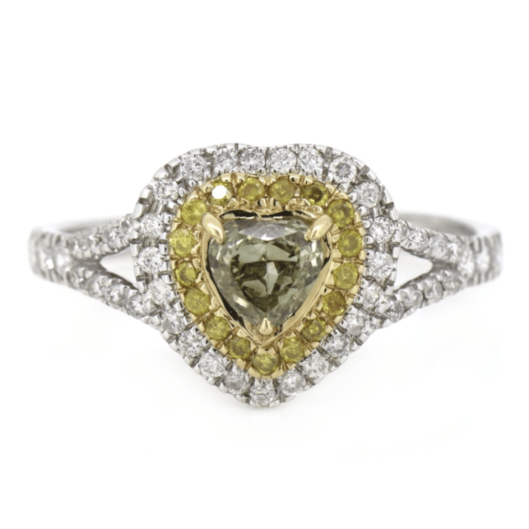 14K WHITE/YELLOW GOLD, FANCY YELLOW DIAMOND AND DIAMOND, DOUBLE HALO SPLIT BAND RING. The Centre Features, One Heart Brilliant Cut, Fancy Yellow, Diamond (0.34Ct, Si1 Clarity), Claw Set In Yellow Gold. Decorating The Innermost Halo Are, 17 Round Brilliant Cut, Fancy Yellow, Diamonds (0.10Ct Tdw, Si Clarity), Bead Set In Yellow Gold. Decorating The Outermost Halo And Decorating The Split Band Are, 47 Round Brilliant Cut, Diamonds (0.36Ct Tdw, H-J Colour, Si-I2 Clarity), Bead Set. Ring Size M. Valuations Provided by an Independent Third-Party Professional Not Directly Associated With Lloyds Auctions at AUD $$16,900.00This valuation has been conducted by an independent third-party professional. The valuation amount is an assessment by the issuing valuer and does not reflect the auction value of the item. Any inquiries regarding the valuation should be directed to the issuing valuer (refer to contact details on the certificate), as Lloyds Auctions has no affiliation or influence over the valuation, the valuer, or the stated amount. Condition: Good - Refer Images 0645842+3130