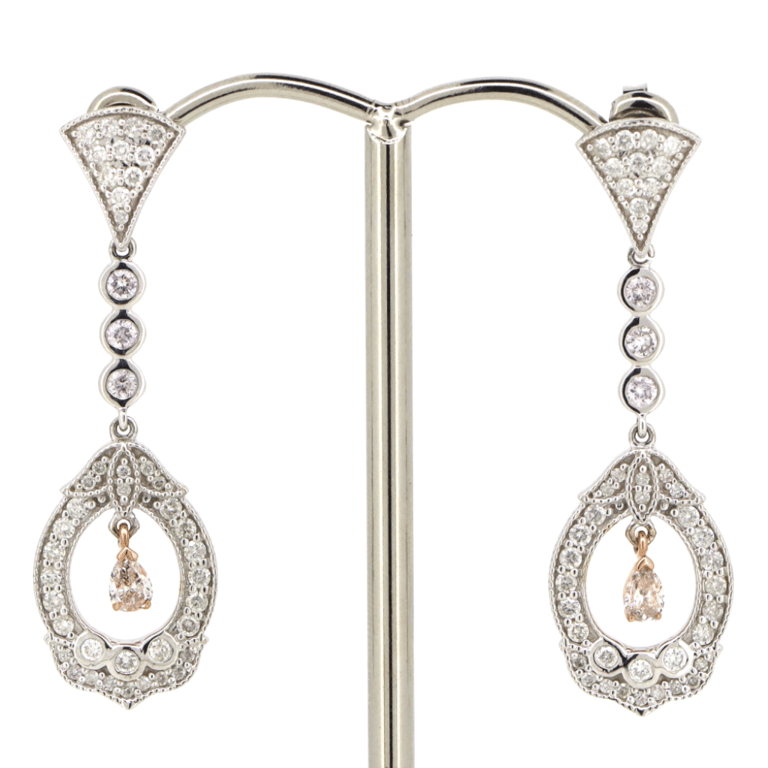 The Design Features, 2 Pear Brilliant Cut, Pink, Diamonds (0.22Ct Tdw, Si2-P1 Clarity), Claw Set In Rose Gold. Encompassing The Design Are, 88 Round Brilliant Cut, Diamonds (0.85Ct Tdw, I-K Colour, Si1-P1 Clarity), Bead/Bezel Set. The Earrings Have Post Backs With 14K White Gold Butterfly Clasps.