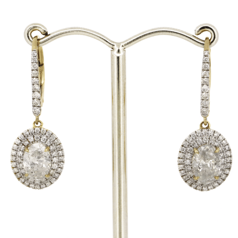 14K YELLOW GOLD AND DIAMOND, DOUBLE HALO DROP EARRINGS. The Centre Design Features, 2 Oval Cut, Diamonds (2.00Ct Tdw, H-I Colour, I2 Clarity), Claw Set. Surrounding In Double Halos And Decorating The Bail Are, 114 Round Brilliant Cut, Diamonds (0.716Ct Tdw, H-I Colour, Si-I2 Clarity), Micro-Claw Set. Earrings Feature Lever Back Closures. Valuations Provided by an Independent Third-Party Professional Not Directly Associated With Lloyds Auctions at AUD $$38,500.00This valuation has been conducted by an independent third-party professional. The valuation amount is an assessment by the issuing valuer and does not reflect the auction value of the item. Any inquiries regarding the valuation should be directed to the issuing valuer (refer to contact details on the certificate), as Lloyds Auctions has no affiliation or influence over the valuation, the valuer, or the stated amount. Condition: Good - Refer Images 0645842+3122