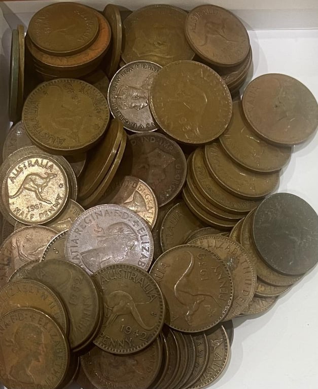 ONE KILO OF AUSTRALIA KGV/KING GEORGE VI/QUEEN ELIZABETH MIX DATE & CONDITION BULK PENNIES & HALF PENNIES MIXED 311104+8