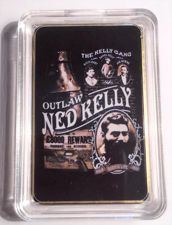 NED KELLY" OUTLAW COLOUR PRINTED HEAVY GOLD ELECTROPLATE (HGE) 999 24K GOLD INGOT/TOKEN..GOLD PLATEDAN INCREADIBLE NEW DESIGN FOR AUSTRALIANA/NED KELLY FANS, THESE NEW COLOURED INGOTS ARE GREAT TO COLLECT, THEY ARE 999 24K GOLD HEAVY GOLD ELECTROPLATE. THEY ARE IN GREAT CONDITION. 311104+5