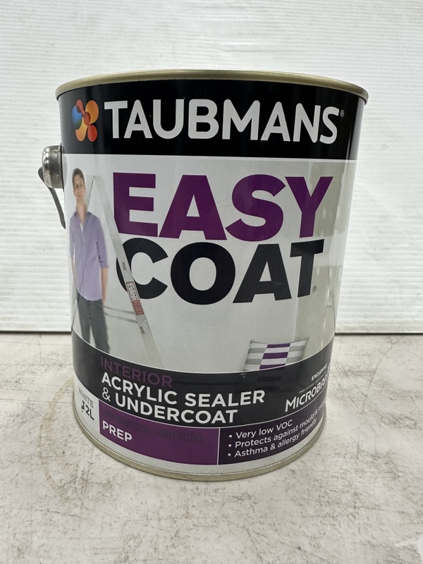 **UNRESERVED** Paint, Taubmans, Easy Coat, Acrylic Sealer & Undercoat, Prep White, 2L Tin BID PER LITRE, MUST TAKE 10 LITRES
