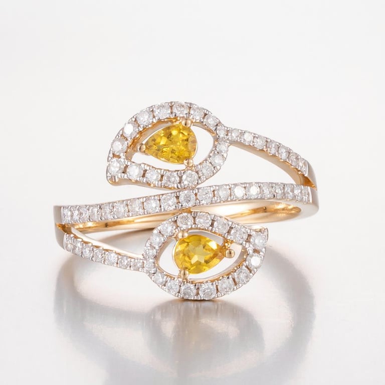Featuring Centre, 2 Pear Cut, Fancy Vivid Yellow Tourmalines (0.32Ct Tsw, Slightly Included) Claw Set With 65 Round Brilliant Cut Diamonds (0.50Ct Tdw, G-H Colour, Vs1-Vs2 Clarity), Pip Claw Set. Ring Size O.