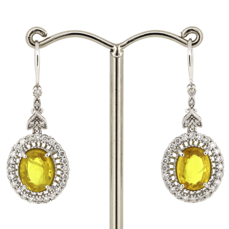 14K WHITE GOLD, YELLOW SAPPHIRE AND DIAMOND, ANTIQUE INSPIRED DROP EARRINGS. The Centres Feature, 2 Oval Cut, Yellow Sapphires (4.67Ct Tsw, Moderate Natural Inclusions), 4 Claw Set. Surrounding The Centres In Halos And Decorating The Hooks/Joins Are, 56 Round Brilliant Cut, Diamonds (0.62Ct Tdw, H-J Colour, Si1-I2 Clarity), Bezel/Bead Set In White Gold With Millegrain Detail. The Earrings Have Shepherds Hooks With 'C' Hook Closures. Valuations Provided by an Independent Third-Party Professional Not Directly Associated With Lloyds Auctions at AUD $$16,200.00This valuation has been conducted by an independent third-party professional. The valuation amount is an assessment by the issuing valuer and does not reflect the auction value of the item. Any inquiries regarding the valuation should be directed to the issuing valuer (refer to contact details on the certificate), as Lloyds Auctions has no affiliation or influence over the valuation, the valuer, or the stated amount. Condition: Good - Refer Images 0645832+5281